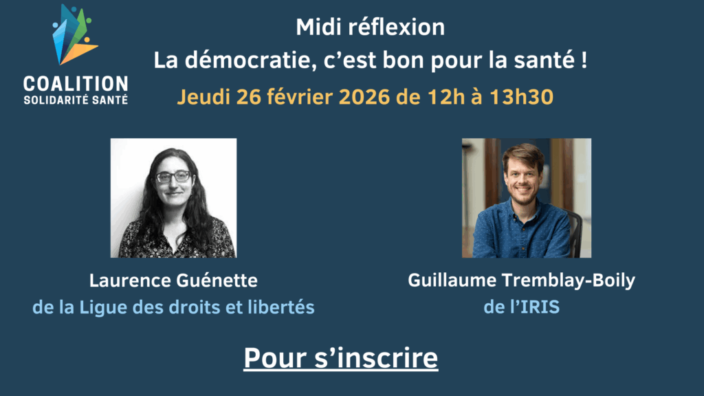 Guillaume Tremblay-Boily de l’IRIS et Laurence Guénette de la Ligue des droits et libertés viendront discuter avec nous de l’importance de la démocratie pour la santé. Nos panélistes aborderont divers aspects des liens entre la démocratie, la participation citoyenne, l’accès aux prises de décision, et la santé globale et l’accessibilité aux soins de santé et aux services sociaux.